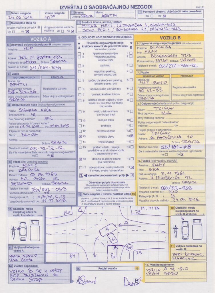 Kao što vidite na ovom primeru, pravilno popunjen Evropski izveštaj o saobraćajnoj nezgodi sadrži: